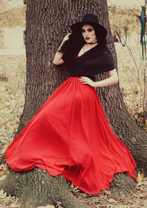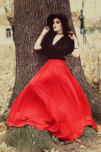 戴着女巫帽的性感女人魔术南瓜女孩玩南瓜