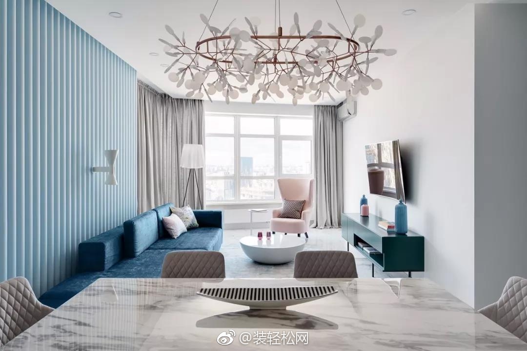 客厅以蓝灰为主,加以其它一两种色彩搭配,