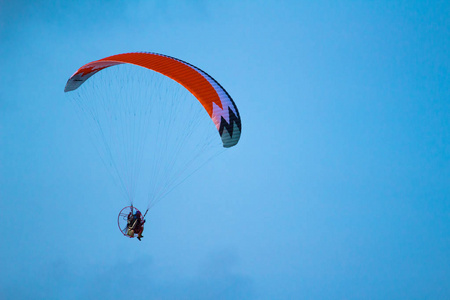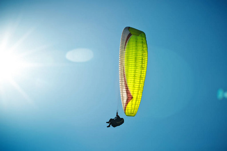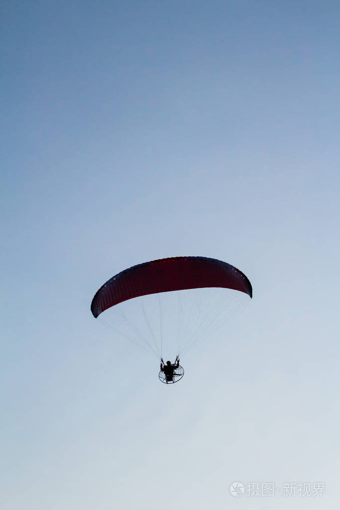 拍摄。极端的生活。一个人飞在滑翔伞上