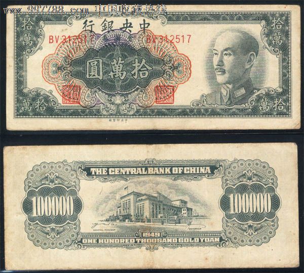 中*银行1949年金圆券十万元\/拾万圆\/100000元517#,民国钱币,民国政府货币,金元券,纸质,万,单件销售,se15606007,零售,中国收藏热线