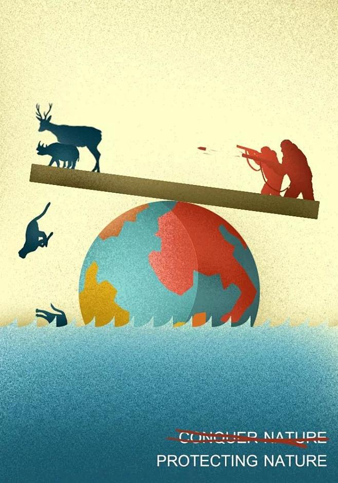 用平衡板来代表人与自然的关系,人们对于自然的破坏,扰乱,其实也是对于自己的毁灭.人与自然是相辅相成的。所以“Conquer Nature”征服自然是不可取的,“Protecting Nature”保护自然才是我们应该做的。