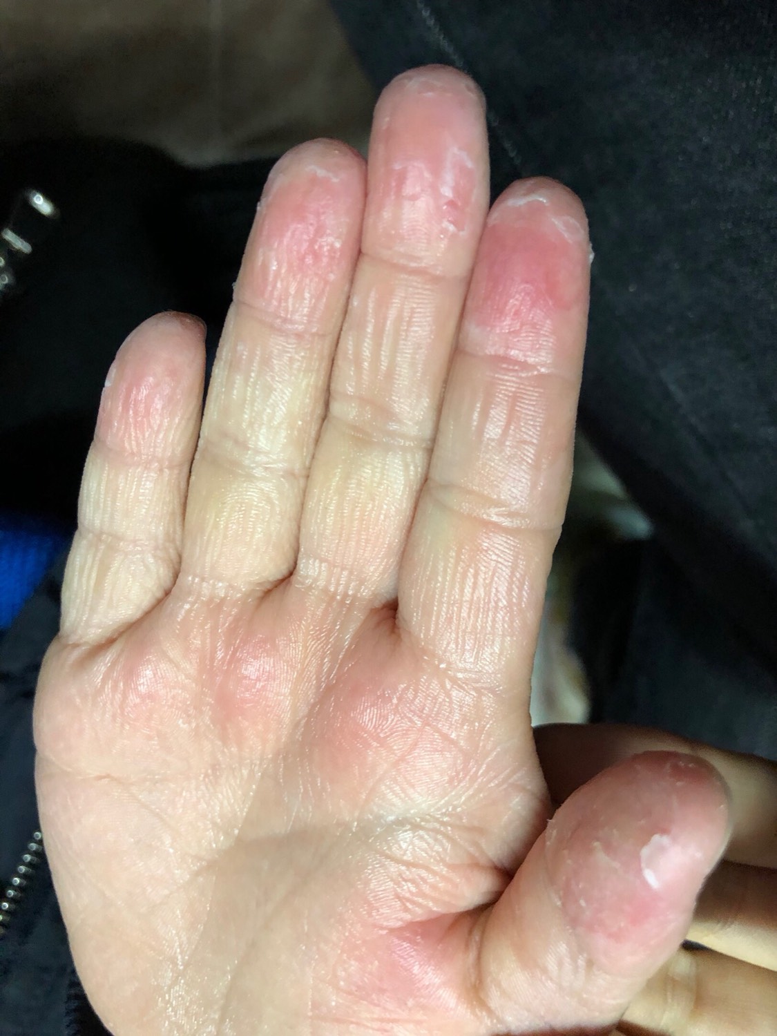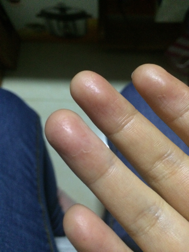 手指尖一开始有小水泡似的疙瘩 然后开始