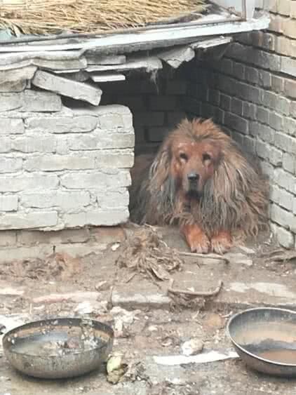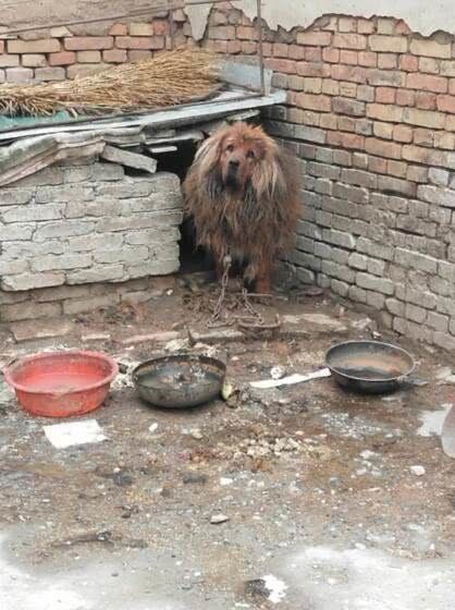 农村金毛被当土狗养,用铁链圈在棚里吃