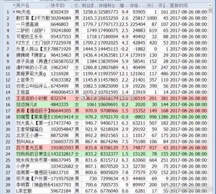 快手粉丝排行榜TOP50(统计截止10月9日)