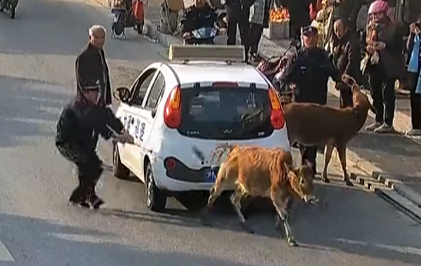 四头黄牛马路撒欢,民警用\"九牛二虎之力\"抓