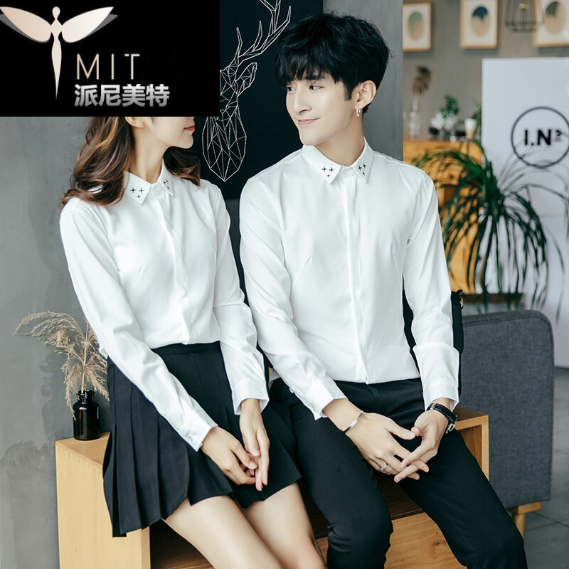 长袖衬衫情侣青年领子刺绣修身长衬衣