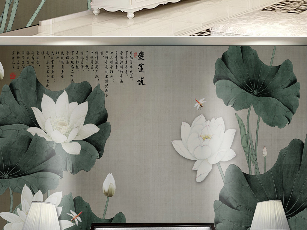 新中式手绘复古荷花背景墙装饰画爱莲说