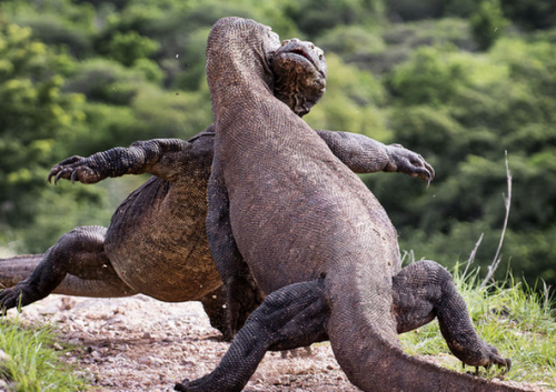 两只科莫多巨蜥打架被拍,纠缠不清,场面颇为滑稽 抱在一起跳双人舞