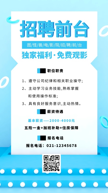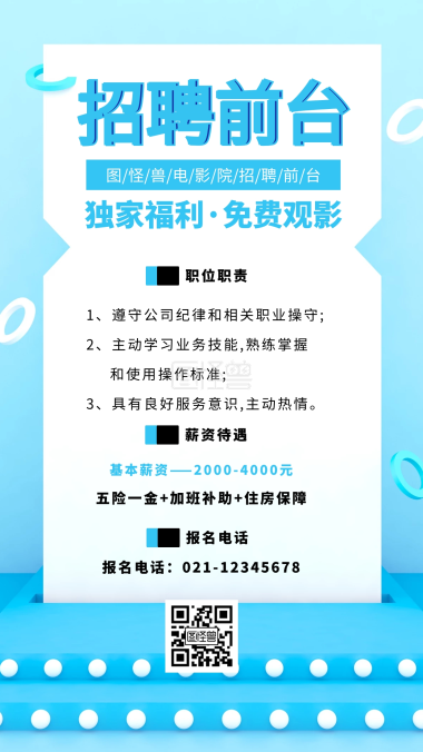 蓝色简约创意影院招聘前台海报