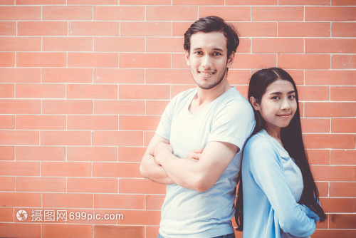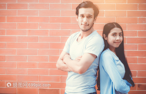 年轻一对有吸引力的亚裔男女肩膀交叉并