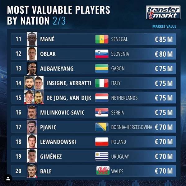 各国身价最高球员排行:法国&姆巴佩第一