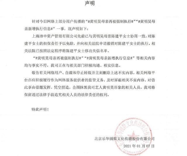 乐华娱乐就黄明昊母亲欠债事件再发声,