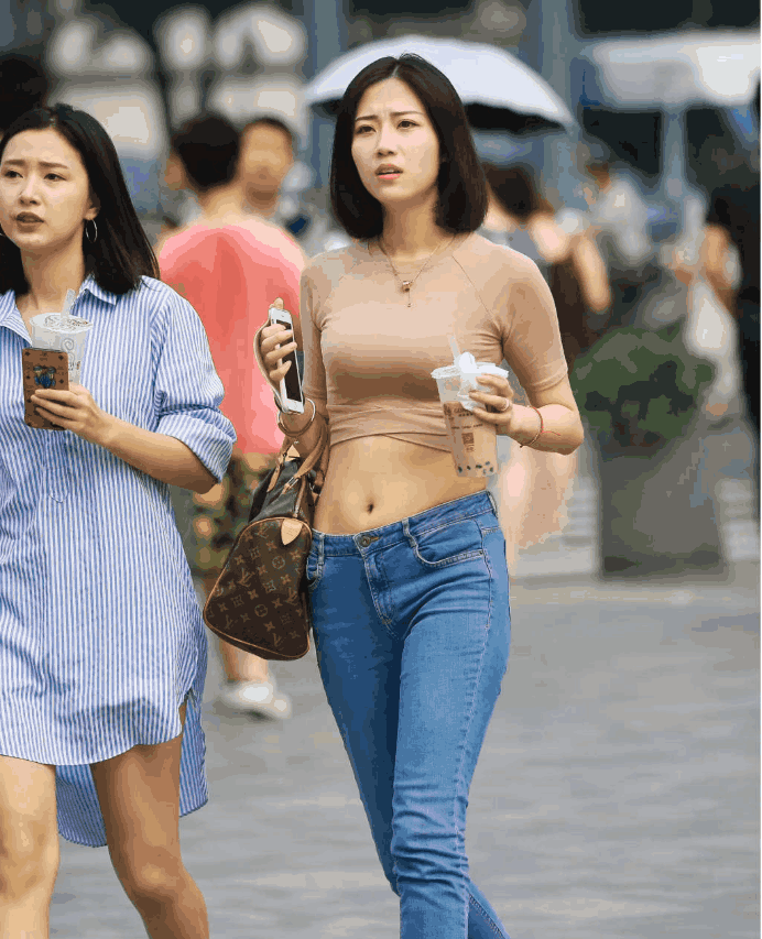 街拍美女:穿上低腰牛仔裤,吊带露脐绝对的