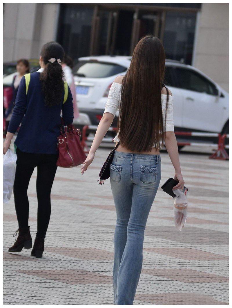 街拍:小姐姐低腰牛仔裤露肩装美女,香气宜人!