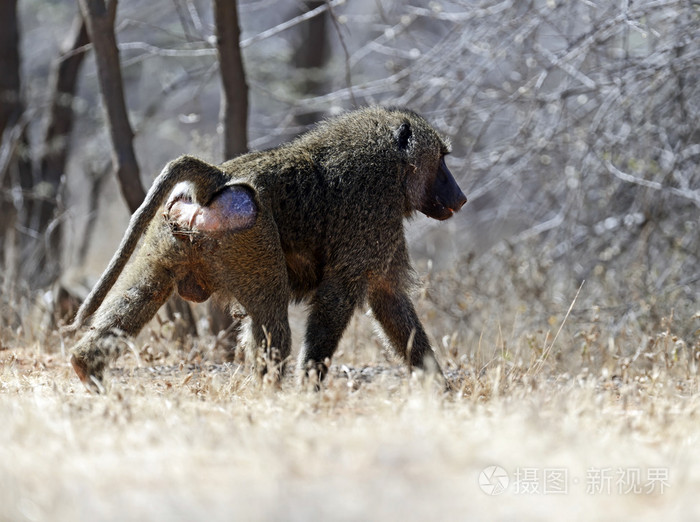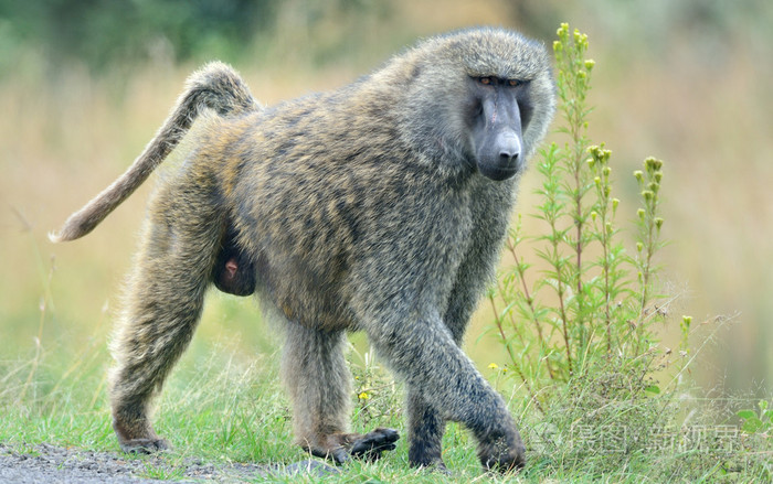 成人阿努比斯狒狒独自行走在非洲大草原上