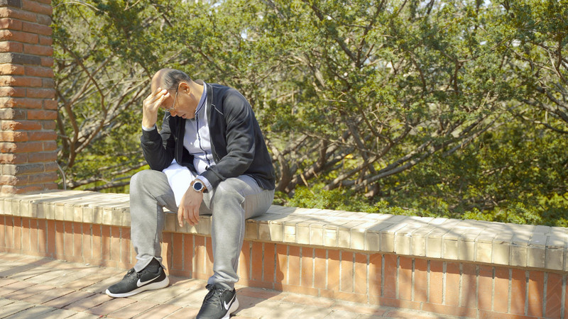 老人独坐在户外头部疼痛揉搓疾病身体不适