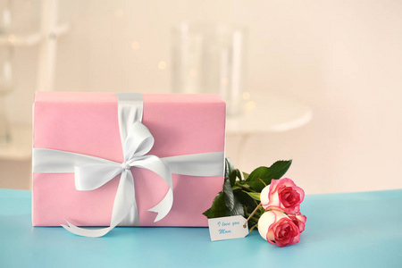 粉红色的郁金香,礼物和贺卡。母亲一天概念