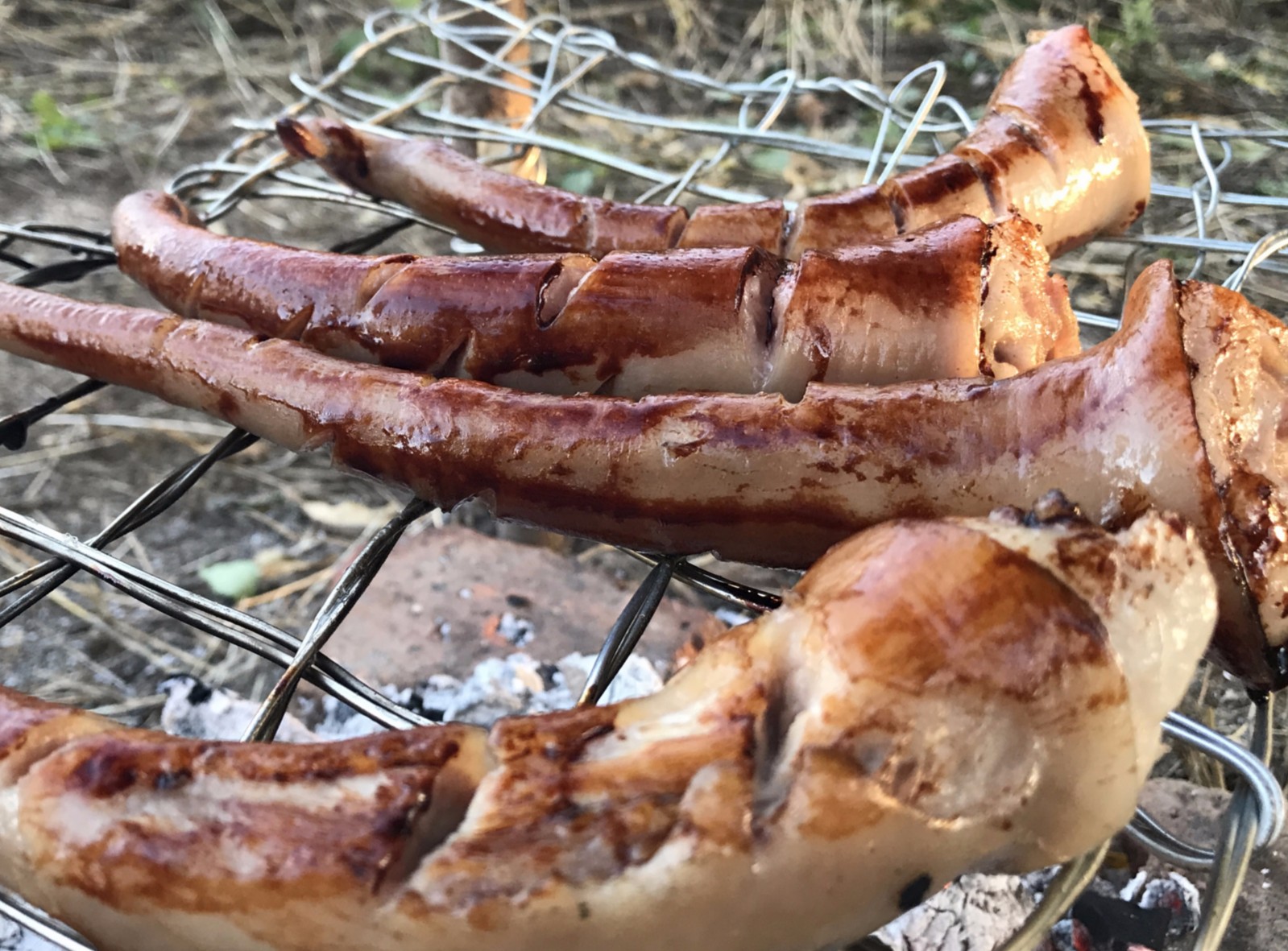 自制香肠烧烤架烹饪和吸烟特写炭火下面