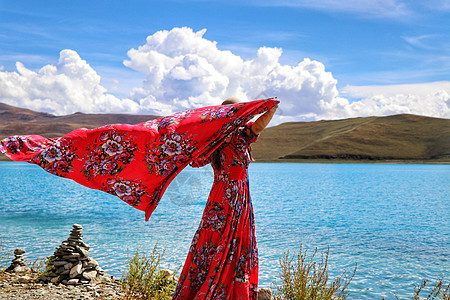 羊湖边的女生背影图片素材库-相似素材高清照片500670772