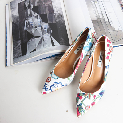 韩版碎花女鞋2017秋季新款尖头刺绣细跟