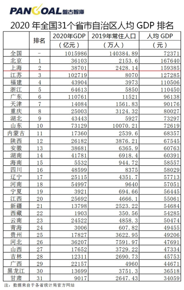 2020年全国31个省市自治区人均GDP公布
