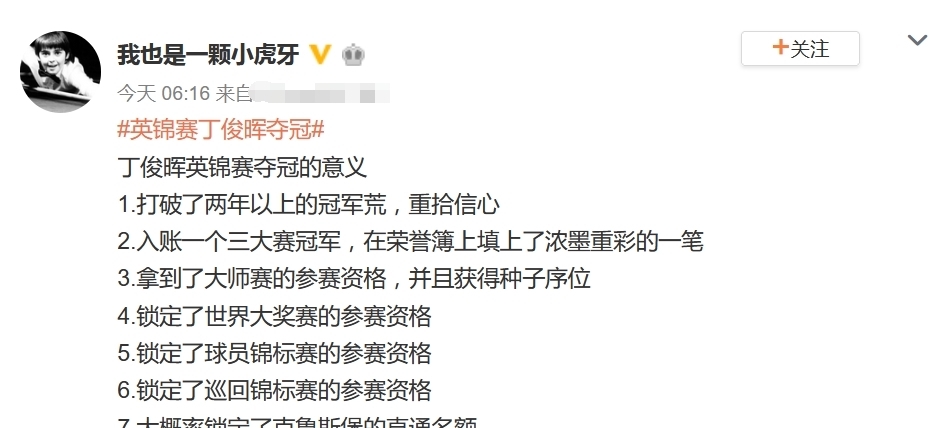丁俊晖赢得了英国冠军,网民们列举了赢得冠军的八大意义!丁俊晖赢得冠军后,他也很快成为互联网上的热点,有很多粉丝和媒体称赞和讨论。一些网民还列举了丁俊晖胜利的八个含义。你认为这有意义吗?让我们来看看: