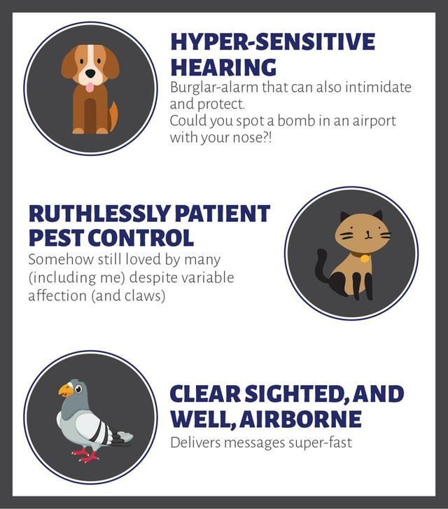 狗:听觉非常灵敏。防盗警报器也能恐吓小偷并提供保护。但是你能用鼻子闻到机场的炸弹吗?