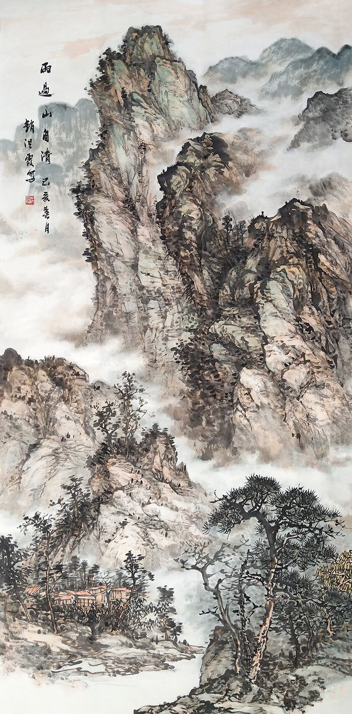 赵红霞的风景画《雨过天晴》是以垂直画的形式呈现的。它精致而大气。这幅画中的山峰非常巧妙和陡峭,有陡峭的山脉和峡谷。白云漂浮在山顶上,树木在群山之间生长。也许这就是刚刚下雨的原因。整个山谷干净而寂静,显得非常空宽敞。