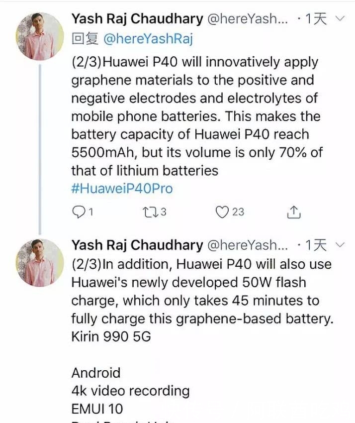 消息人士称,华为P40 Pro可能采用石墨烯电池技术。通过这项技术,有可能在不改变电池体积的情况下提高耐用性和充电速度,这对于即将到来的5G时代非常友好。