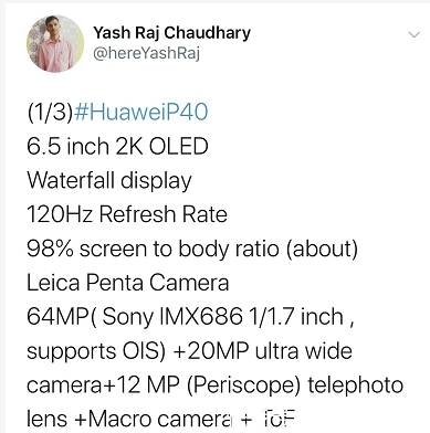 此外,在屏幕规格上,昨日透露华为将为华为P40提供分辨率为2K、刷新率为120赫兹的6.57英寸有机发光二极管屏幕。