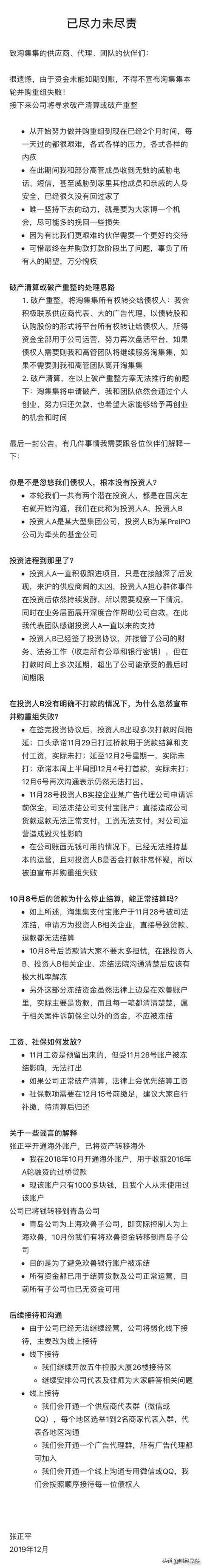 12月9日凌晨,淘大CEO张正平正式宣布淘大破产。