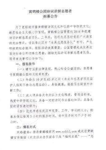 值此第34届世界志愿者日之际,为了更好地传播黄鹤楼的诗歌文化,弘扬中国传统文化,黄鹤楼公园管理局再次公开为社会招募志愿者,并继续充实诗歌翻译志愿者队伍。
