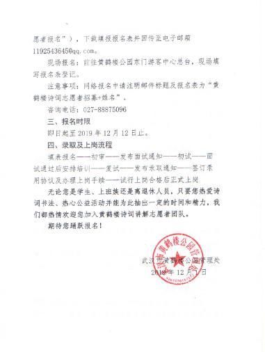 在线注册:在www.cnhhl.com官方网站黄鹤楼注册或关注黄鹤楼官方微信。下载并填写申请表,然后将其返回1192543645@qq.com电子邮件。请注明邮件标题和申请表为“黄鹤楼诗歌志愿者招募+姓名”。