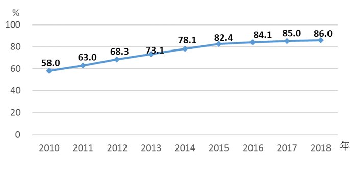 3.农村环境得到了加强。党中央、国务院发布的《农村振兴战略规划(2018-2022)》为提高农村环境质量、优化农村生活环境提供了制度保障。美丽乡村的建设取得了坚实的进展。2018年,农村集中供水受益者比例达到86%,比2010年高出28个百分点,比上一年《纲要》设定的“85%左右”目标(见图8)向前迈进了一步。