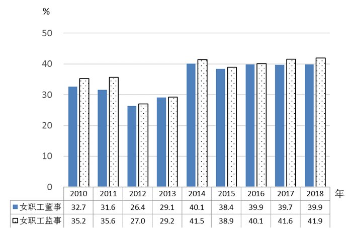 2.妇女积极参与企业管理。2018年,女性职工董事占企业董事会职工董事的39.9%,占企业监事会职工监事的41.9%,分别比上年上升0.2%和0.3个百分点,比2010年上升7.2%和6.7个百分点(见图6)。