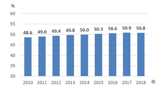 3.[高中女生的比例继续增加。2018年,高中女生人数为1858.4万,占学生总数的47.4%,比2010年增加0.3个百分点。高中教育毛入学率从2010年的82.5%上升到2018年的88.8%,增长6.3个百分点。其中,自2015年以来,普通高中女生比例已超过一半,2018年为50.8%,比2010年增加了2.2个百分点(见图3)。