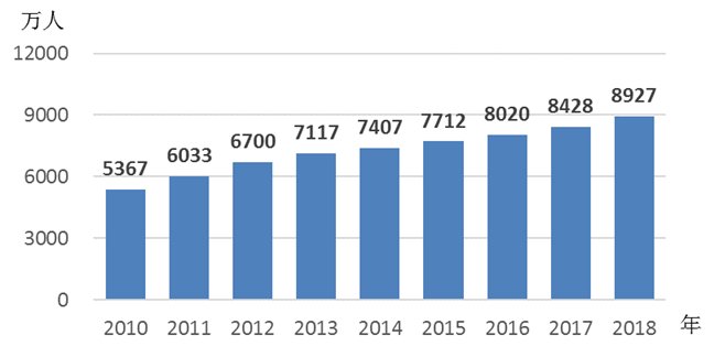 1.对妇女的产妇保护水平有所提高。生育保险关系到大多数女性雇员的切身利益。近年来,参加生育保险的妇女人数迅速增加。2018年,参加生育保险的妇女人数达到8 927万人,比上年增加499万人,即5.9%,比2010年增加3 560万人,即66.3%(见图7)。女性被保险人占所有被保险人的43.7%,与前一年相同,比2010年增加了0.2个百分点。
