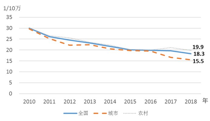 2.产妇死亡率继续下降。2018年,孕产妇死亡率为18.3/10万,比上一年下降6.6%,比2010年下降39%,高于中等收入和高收入国家的平均水平。同期,城市和农村地区的孕产妇死亡率分别为15.5/10万和19.9/10万,分别比上年下降6.6%和5.7%,比2010年下降47.8%和33.9%(见图1)。