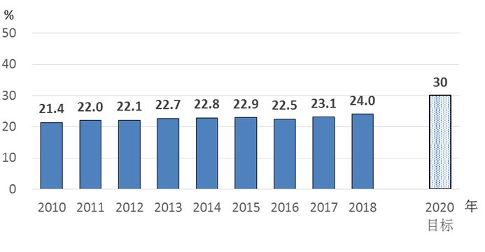 2018年,妇女在村委会成员中的比例为24%。虽然比上年高出0.9个百分点,比2010年高出2.6个百分点,但与“纲要”目标“达到30%以上”仍有差距(见图9)。