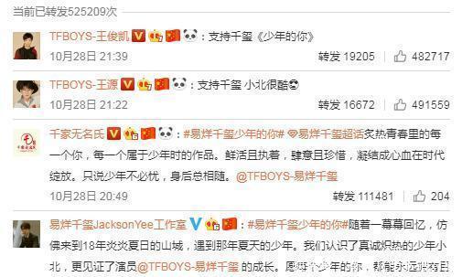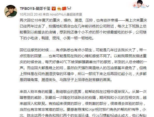 易烊千玺的微博发表了一篇长文,回顾拍摄《年轻的你》的艰难和激动,感谢导演帮助进一步了解小北的角色,有着高标准的合作和默契的环境,有着如此深刻的影响和残酷温柔的体验。
