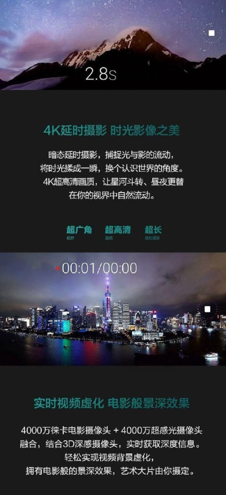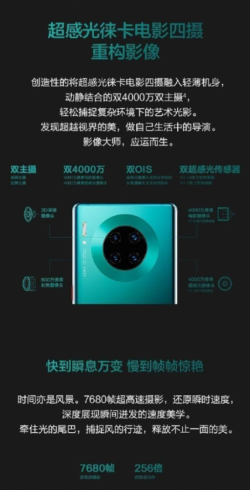 Mate 30系列还将推出照片/视频,这也是华为手机最强有力的标志之一。在特定的新机器上,后面四个摄像头是双40MP主摄像头和8MP远摄3D深度摄像头,支持超高清夜间拍摄和7680帧超高速拍摄。内置双ISP将大大提高暗光下的拍摄效果。它还支持4K延迟视频和30倍数码变焦等。前透镜是3200万像素。