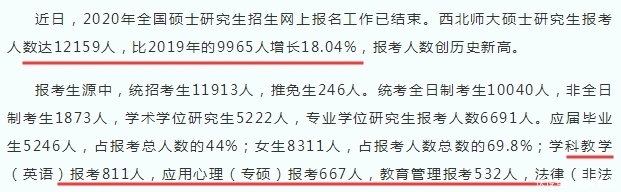 西北师范大学研究生人数达到12,159人,比2019年的9,965人增加了18.04%。