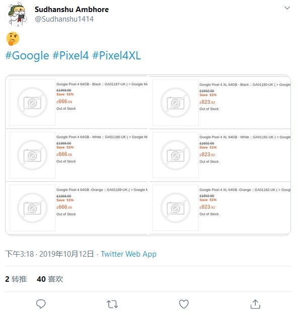 谷歌像素4/XL英国曝光价格:约人民币5969元