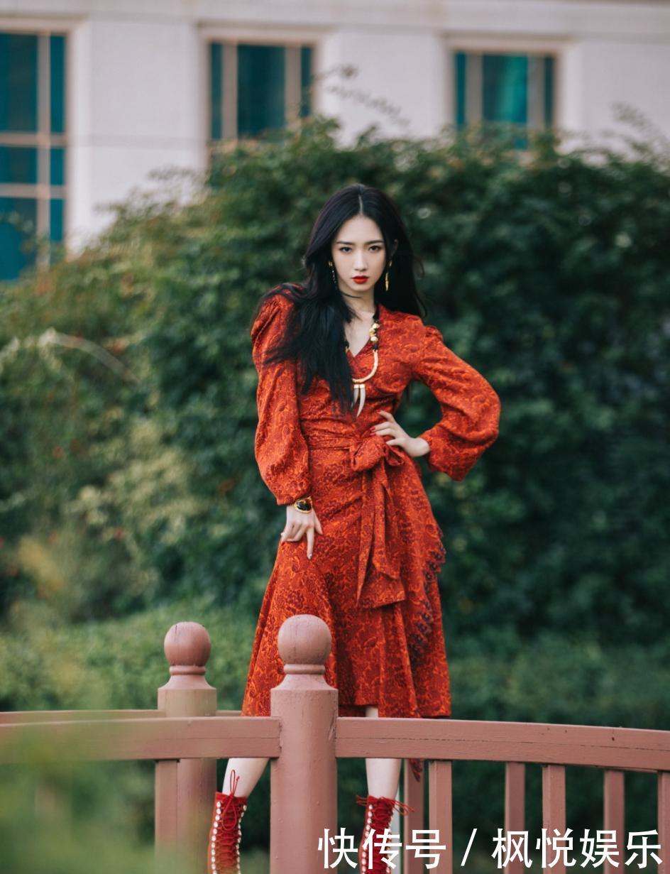 红色印花连衣裙,明亮复古,搭配蝴蝶结腰带凸显腰线,展现苗条身材,脚下一双黑色短靴,引人注目耀眼,柔软中带一丝凉意,异国情调的配饰构成,展现出不同的时尚魅力,一条长卷发披肩,红唇火红,迷人,沙沙作响,美丽。