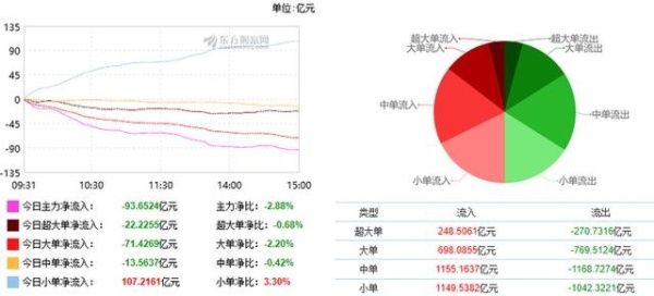 根据蔡东的统计数据,沪深股市当天出现资金净流出,当日净流出93.65亿元。今天,超大订单净流出22.23亿元,大订单净流出71.43亿元,单个订单净流出29.61亿元,小订单净流入85.43亿元。