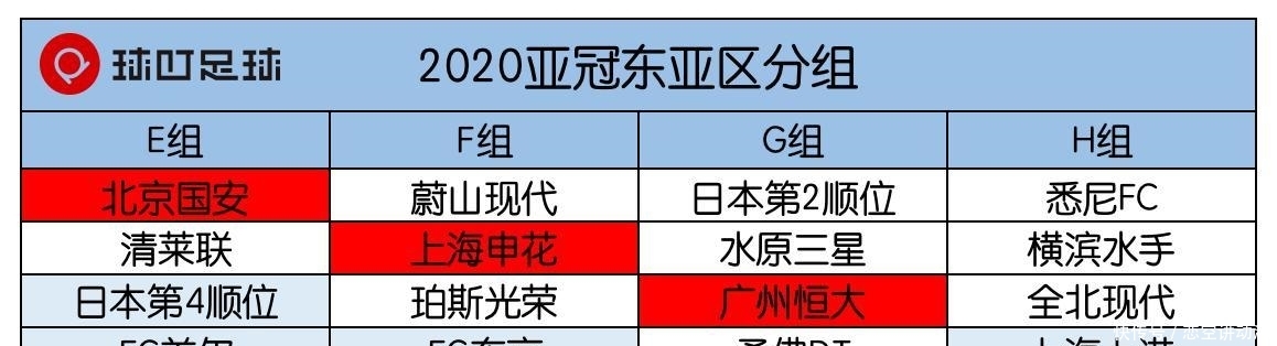 在2020年亚锦赛抽签中,广州恒大与日韩两大杯赛冠军同组,韩国足总杯冠军水原三星和日本天皇杯冠军待定,极有可能是鹿儿岛鹿角或神户胜利船,而另一个对手是马来西亚的柔佛DT。上海上港需要再打一场比赛,将与澳大利亚超级决赛冠军悉尼足球俱乐部(Sydney FC)、日本J联赛冠军横滨水手队(横滨水手队)和韩国K联赛冠军全北现代队(Quanbei Hyundai)一起进入死亡小组。然而,北京国安和来自泰国的亚洲冠军清莱是同一个组。另外两个是来自日本和韩国的第四支队伍。足总杯冠军申花有更好的签约机会。对手是英王联赛亚军蔚山现代和澳大利亚的亚洲冠军珀斯光荣。另一个对手可能是日本联赛亚军东京足球俱乐部。