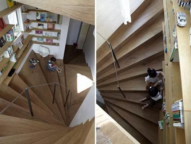由于空间狭小,住宅采用螺旋连续空的组织功能,整个内部空是一个大楼梯,一些休息平台分布在该时期。为了合理和充分利用有限的空间空,设计师充分利用墙面,如你看到的书架和书架。厨房和餐厅位于顶层,而卧室位于大楼尽头的大型“休息平台”上。作为车库和入口,一楼只能容纳2/3的车身...虽然线圈空房间很小,但它不会降低生活质量。你可以看到在大楼的顶部还有一个露台,可以喝茶。
