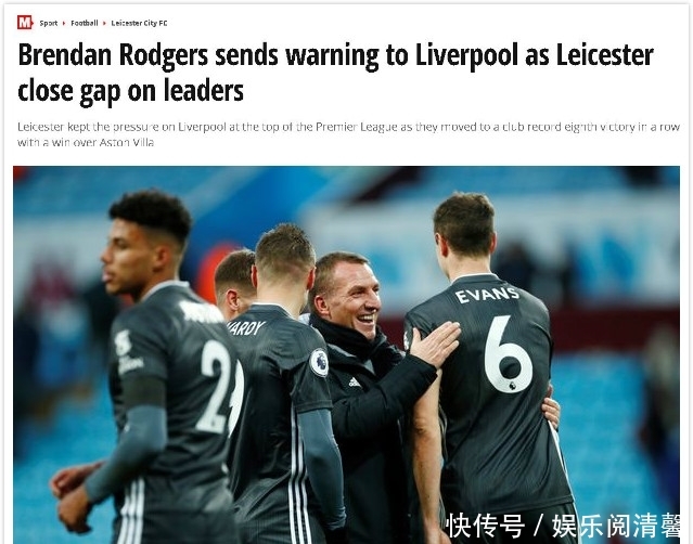 《镜报》报道称,莱斯特城在连续八场比赛获胜后,在冠军赛中超过了曼城。尽管落后利物浦8分,雄心勃勃的罗杰斯仍然表达了他对冠军的渴望,警告莱斯特城将努力赶上前面的球队。联赛还剩22轮,这位前英超冠军还有机会。