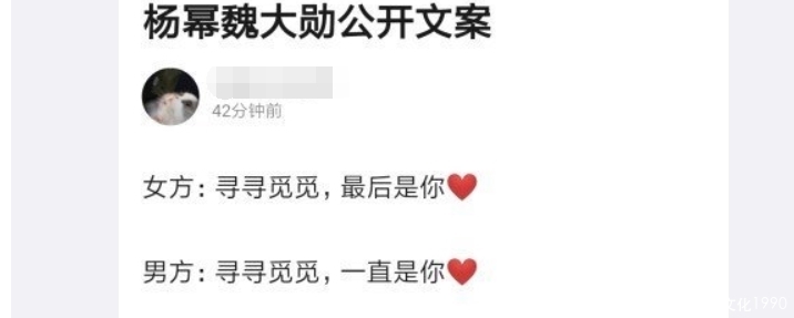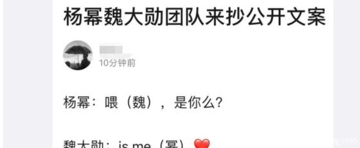 还有一个思想开放的文案,他说:“寻找和发现,不放弃就不要离开;我们是朋友,无论男女。”这种CP粉太有才了。我不知道杨迷你和魏大勋在承认爱情或澄清误解方面是否大方。