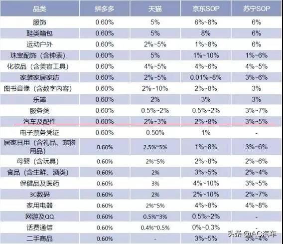 与天猫和JD.com相比,多多的进入条件和佣金率相对较低。对比这些主要的电子商务平台,可以看出,多种汽车及配件的佣金率为0.6%,京东和天猫的佣金率最高,为5倍以上。
